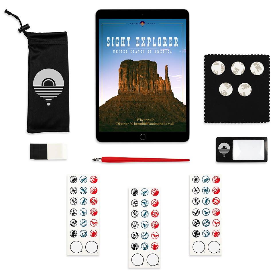 Next comes an extra fun part: stickers! You’ll find 3 sheets of activity and memory stickers: 6 speech bubble stickers for you to write names or words, as well as black, blue and red pin shaped stickers to personalize your scratch map. Stickers include scuba diving, sailing, skiing, trekking, climbing and horse-riding, so that you can relieve your adventure every time you set eyes on your map. Use the plastic pocket eyeglass to look at all the details on the map.