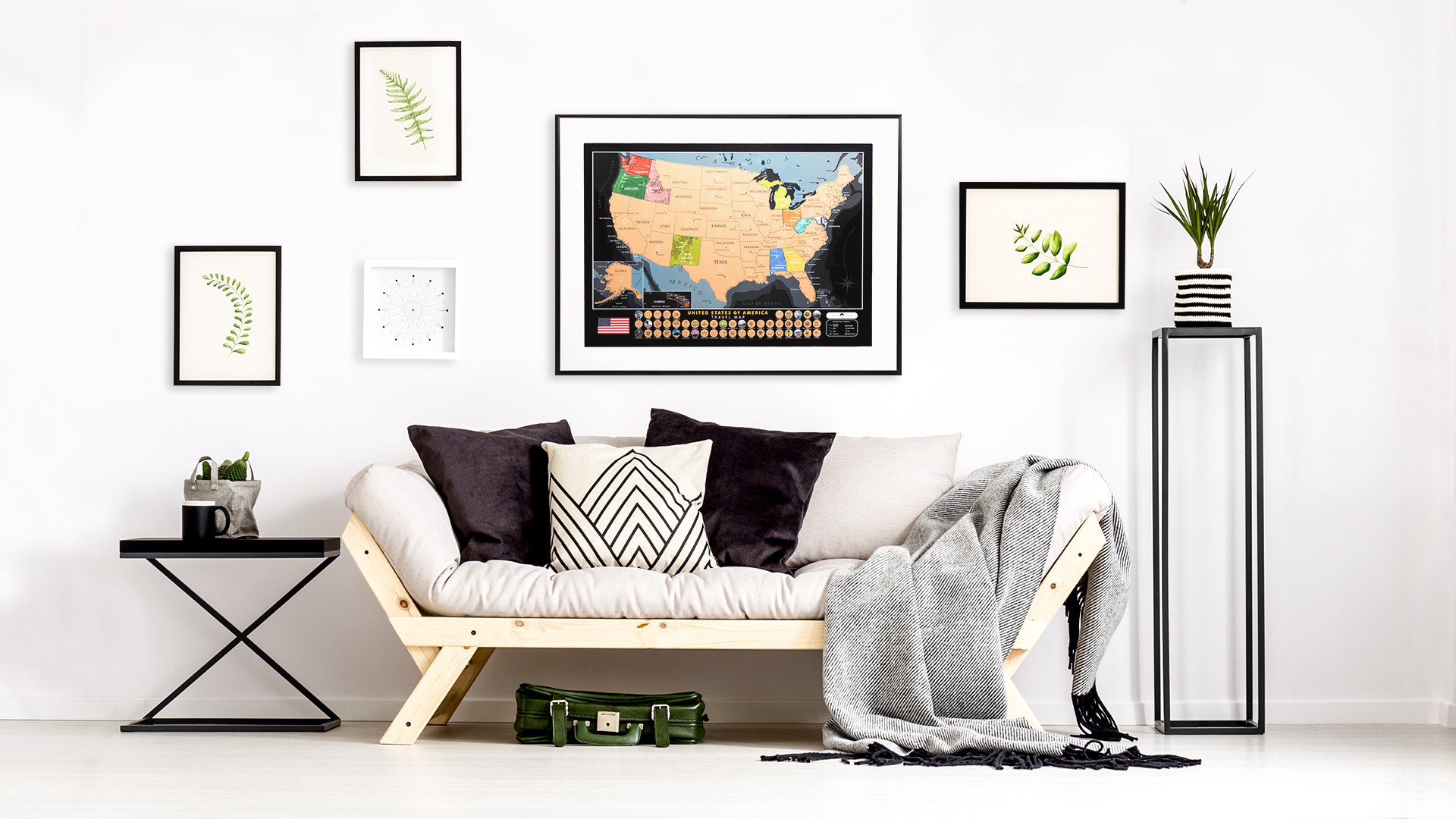If you plan on keeping your scratch map up for a long time, it’s best to invest into a frame. This way, you can also take it with you if or when you move house. To pick a frame, take into account the visual style of the room you plan on hanging it in. The safest bet would be a thin satin or smooth black frame, but you can also pick something crazy or something that’s the same style as your home. If your furniture is colored wood, like mahogany, a matching frame might be a good idea. Also, if you want to turn this scratch map into a statement piece, you can pick something more colorful like a turquoise frame, or even go over the top with a gold one.