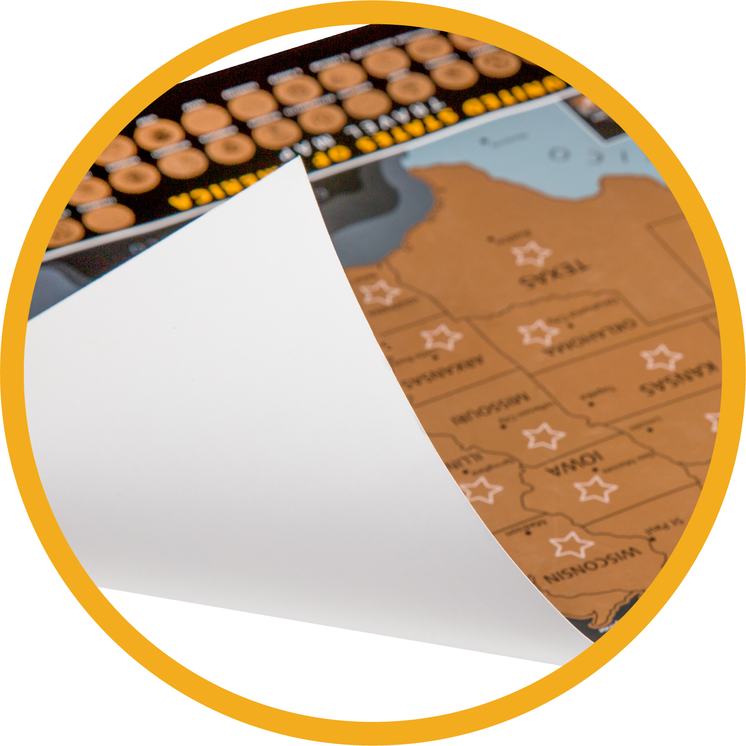 We included 5 3M stickers so that you can stick your scratch map up. They work on glass, wood and walls. Just place your map face down on a flat surface, peel the foil from one side of the stickers, sticking one on each corner and the last one in the center. Next, peel the other foil from the 3M stickers and place it on your surface of choice.